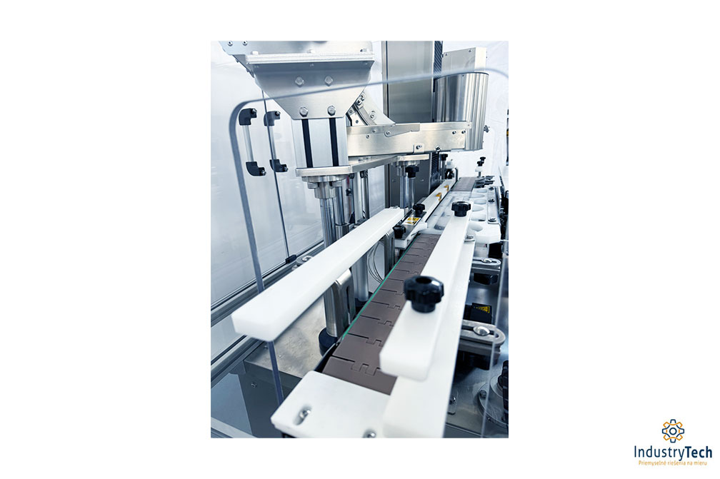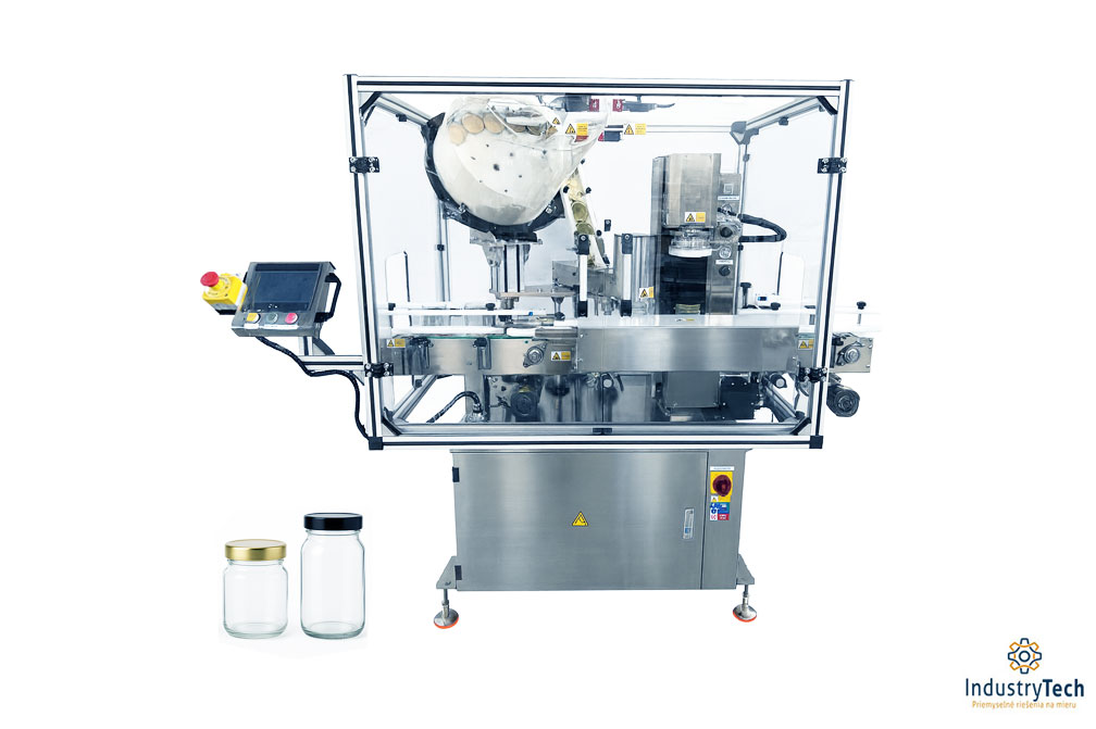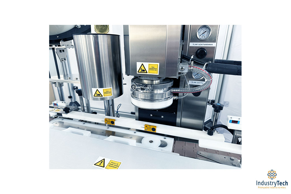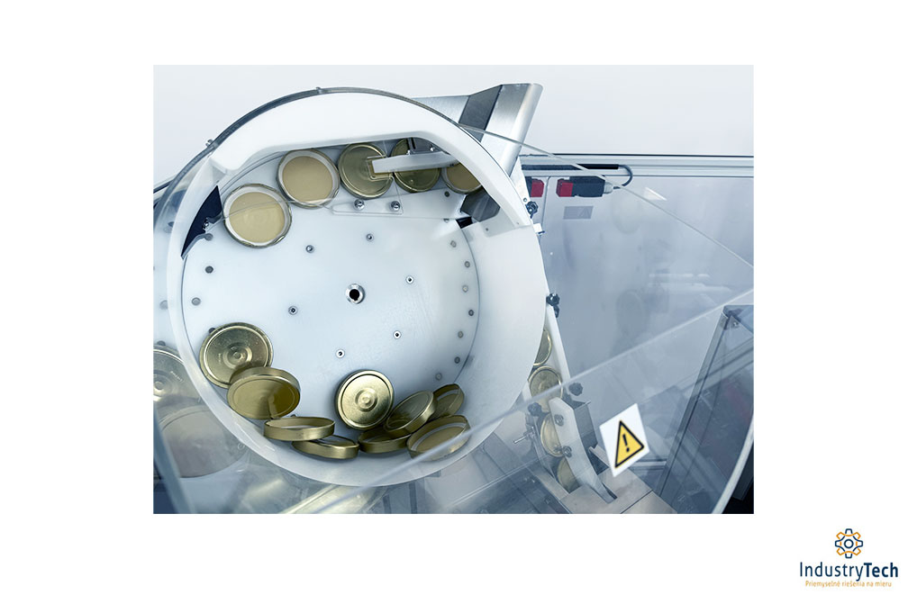 Vákuovo uzatváracia linka aplikuje hliníkové viečko na obaly, ktoré sú dopravené dopravníkom pod zásobník s viečkami, kde sa viečko nasunie na obal.